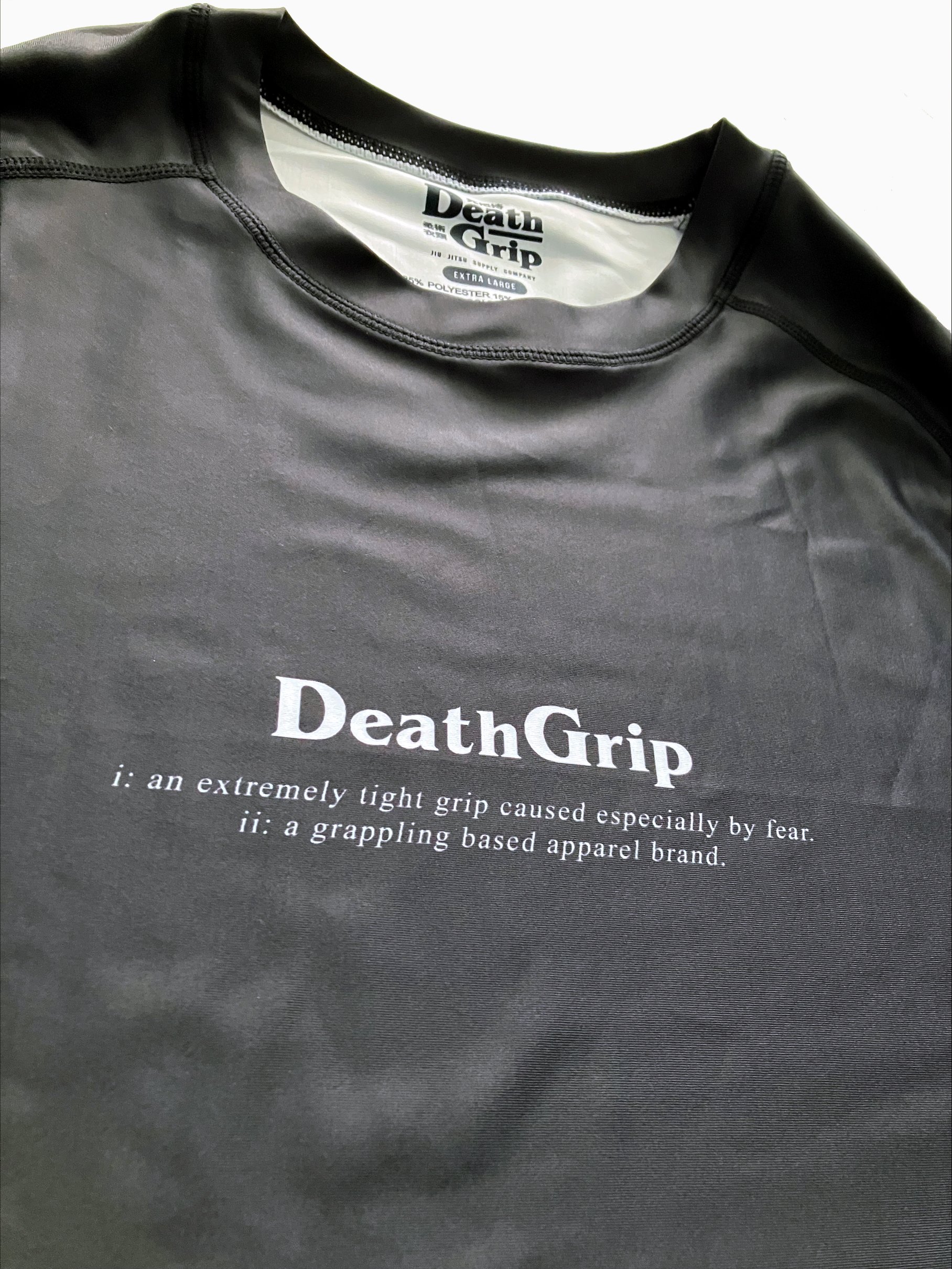 Black short sleeve rashguard, featuring a back print, chest print, inside neck label