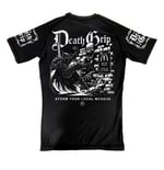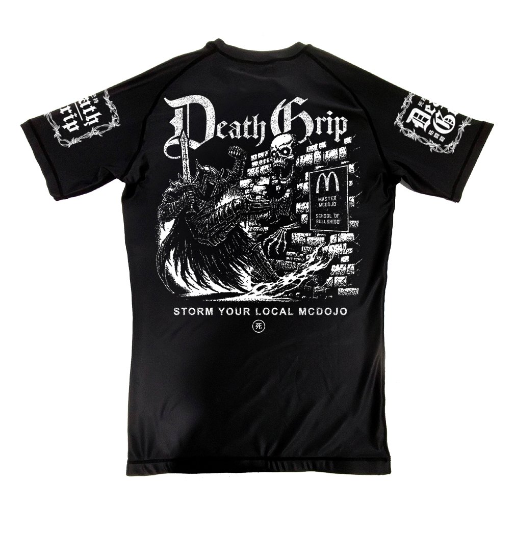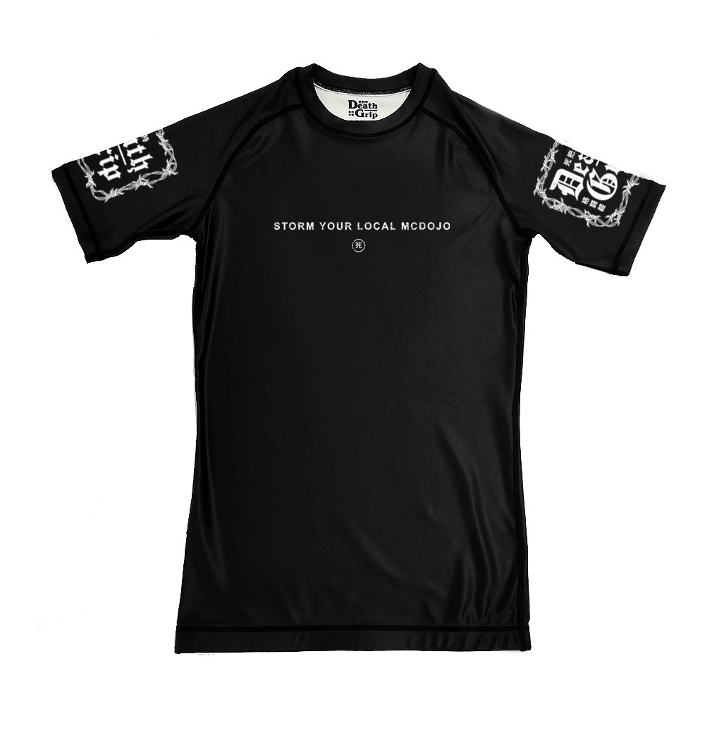 Black short sleeve rashguard, featuring a back print, chest print, sleeve prints, inside neck label and inside rubber waistband to ensure rash guard stays in place.
