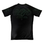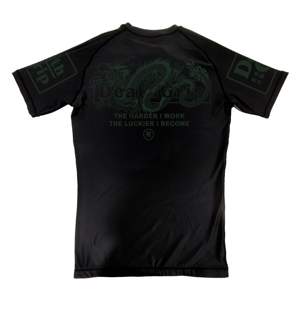Black short sleeve rashguard, featuring a chest print, huge back print, sleeve prints, inside neck label and inside rubber waistband to ensure rashguard stays in place.