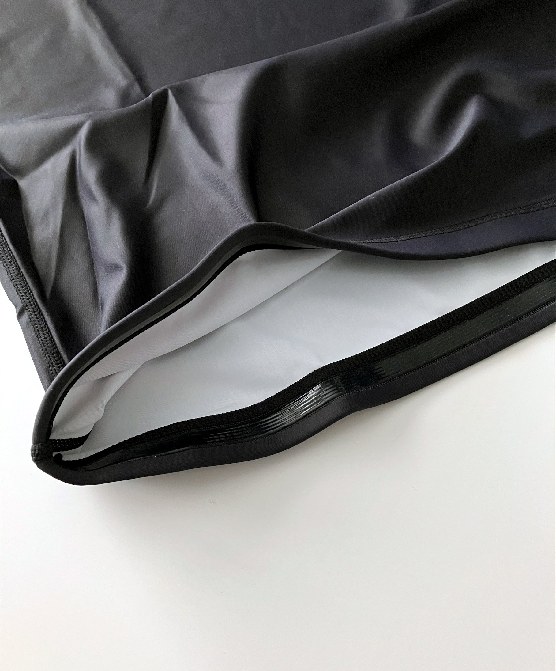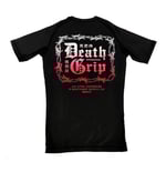 Black short sleeve rashguard, featuring a back print, chest print, inside neck label