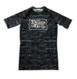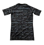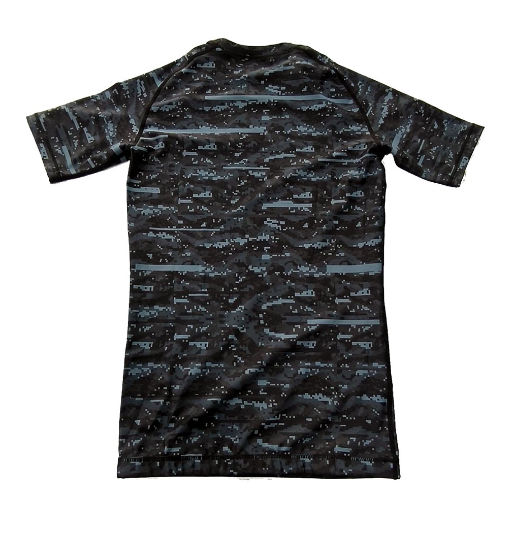 Glitch camo short sleeve rashguard, featuring a chest print, inside neck label